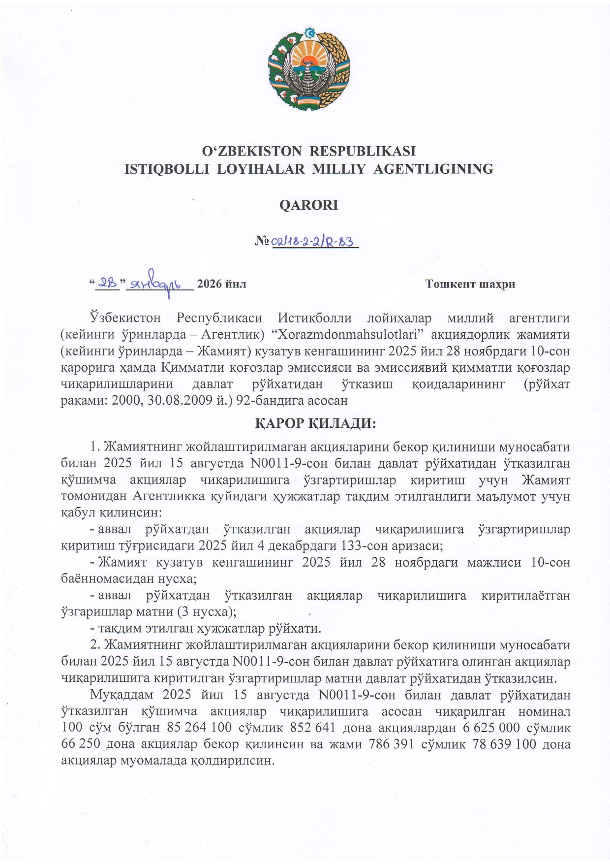 “Хоразмдонмаҳсулотлари” АЖ қўшимча чиқарилган акцияларни олишга бўлган имтиёзли ҳуқуқдан фойдаланиш тўғрисидаги БИЛДИРИШНОМА